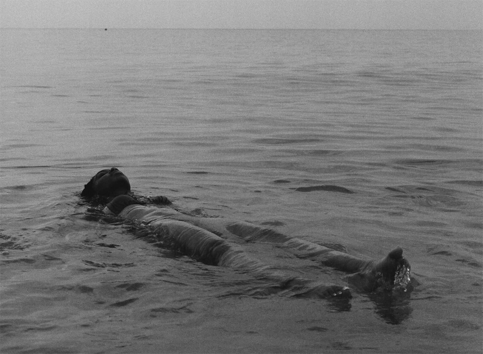 There is a woman, her shoulders straightened back, her chin held high, leading in the direction of her hair—braids pulled into a tight ponytail. Her gaze is resonant, lacks the solidity of distinguishable eyes, pupils, or retinas, rather an ounce of white in the sea of her Black skin outlining a 1960s mod box silhouette dress. Her right hand is brazenly upwards, almost as if she were sourcing her powers unencumbered through her palms, lightly surfacing the palm tree above, below, hand, the sky meets the water waves—she stands as a divider between this environment and the metropolitan life that surrounds her. Holding both worlds within her and breathing outside of them as well.