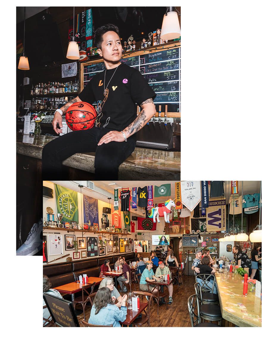 The bar is a beautiful mix of people, sexual identities, ethnicities, and ages. Kids eating chicken nuggets, lesbians having a beer with their burger, and men cheering at the tops of their lungs while sipping sodas. It’s a true microcosm of society. Then, we see Jan Jensen, an openly gay Iowa basketball coach, interviewed on a few of the TVs, and it falls quiet as people listen to what this sports queen has to say.